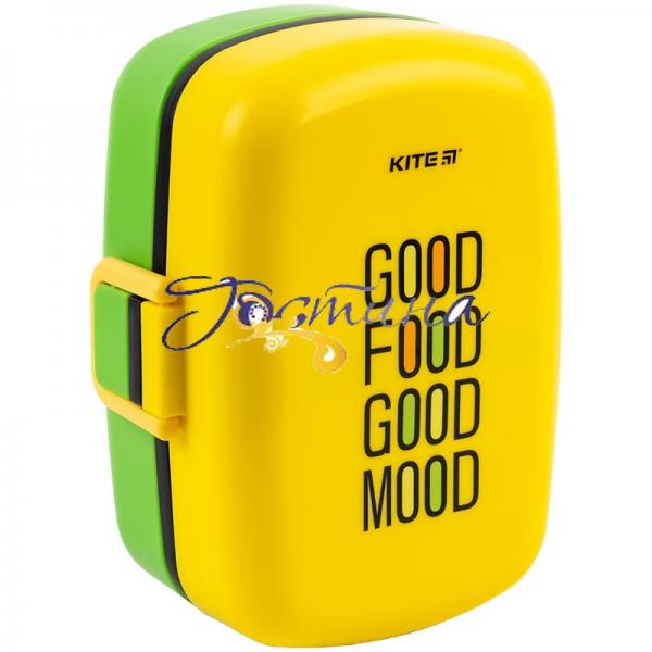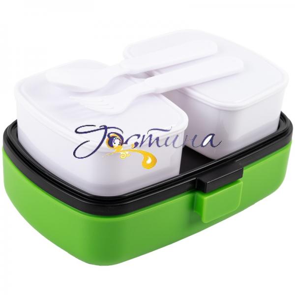 Ланчбокс розділений на дві частини, містить всередині 2 додаткові окремі ємності, які закриваються; має пластикову ложку та виделку. Це дуже зручно та гігієнічно.