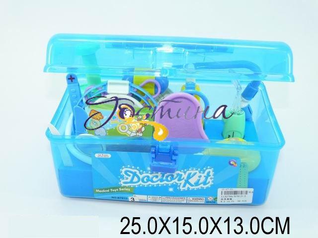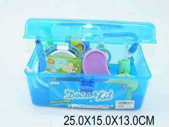 Докторський набір у валізі. У набір входить: стетоскоп з пищалки, стоматологічне дзеркало з підсвічуванням, шприц і термометр з рухомими елементами, молоточок, окуляри, налобний рефлектор, дзеркало (імітація), два скальпеля, ножиці, блюдечко, окуляри, картонна коробочка для ліків, таблиця для перевірки зору і беджіки доктора. Чемодан на на клямці.