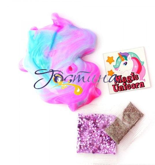 У наборі є зручна баночка у формі єдинорога, блискітки та яскрава авторська тематична наліпка.