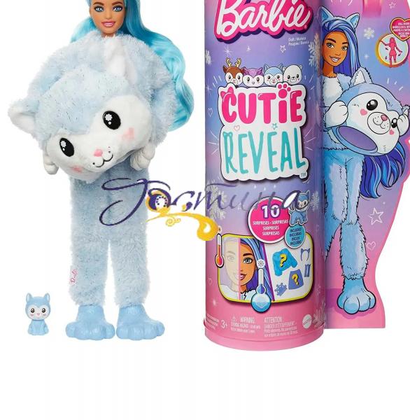 Ляльки Barbie Cutie Reveal пропонують найсимпатичніший досвід розпакування з 10 сюрпризами, включаючи ляльку Барбі! Також усередині чотири пакети із сюрпризами. Зніміть костюм, побачите ляльку Барбі з довгим волоссям та блискучими деталями. Відкрийте пакети з сюрпризами, щоб знайти мерехтливий одяг, аксесуари, губку-гребінець і міні-вихованця.