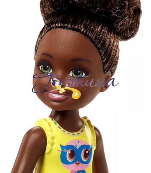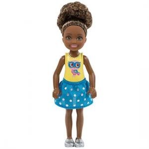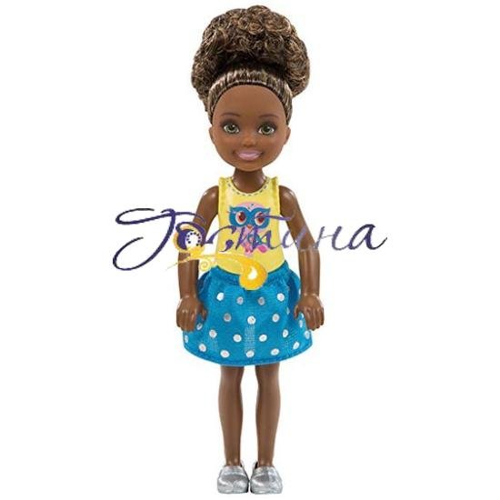 Лялька одягнена у жовтий топ із совою та синю спідницю у горошок,