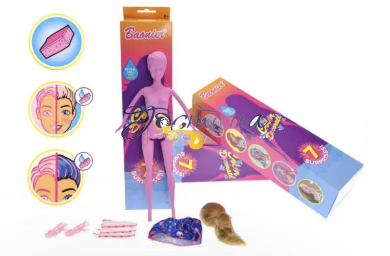 На ляльку нанесена фарба. У колбу треба набрати воду, помістити туди ляльку. З ляльки змивається вода, і можна побачити персонажа.
