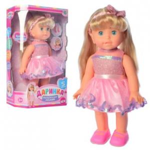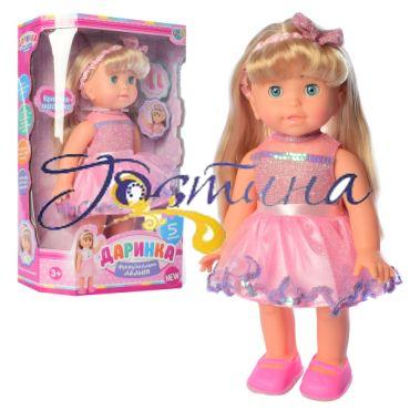 Мила лялька на ім'я Даринка стане справжньою подругою для Вашої дитини! Хороша сукня, симпатичні рожеві туфельки і красиве золотисте волосся не залишать байдужою жодну дівчинку. Лялька не тільки сприятиме гарному настрою дитини, а й поповнить також її словниковий запас. Даша знає 10 фраз, вміє ходити, загадувати загадки та співати пісеньки, реагує на бавовни у долоні. Граючи з нею, Ваша дочка також розвиватиме і комунікативні навички. З нею Ваш малюк отримає лише позитивні емоції!