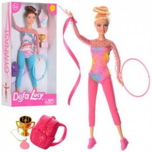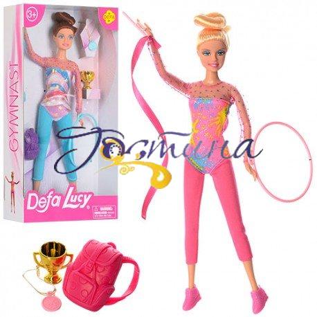 Набір складається з ляльки гімнастки в костюмі і аксесуарів для гри, обруча, кубка, рюкзака, медалі