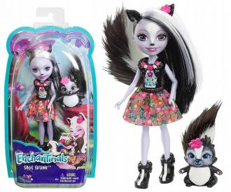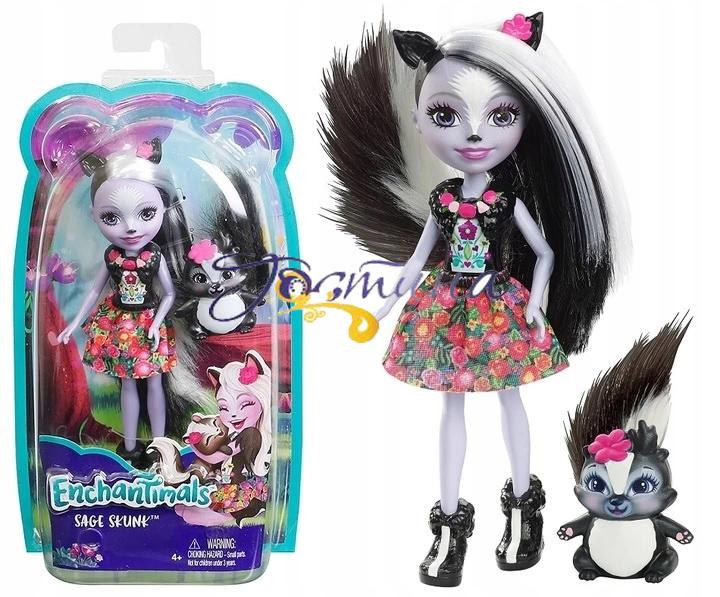 Вас зачарують милі Енчантімалс Сейдж і її вихованець - скунсик. У них однаковий характер і навіть зовні вони дуже схожі, адже у обох є пухнастий чорно-білий хвостик і рожева шпилька у вигляді квіточки, а у лялечки ще і розфарбоване обличчя у вигляді мордочки скунса. Її дивовижне довге волосся розпущене, проте їй можна робити різноманітні зачіски. Лялька одягнена в модний топ і стильну спідницю з квітковим принтом, яку можна знімати і одягати її в інші наряди, і в модні черевики чорно-білого кольору. У ляльки рухливі руки, ноги і голова, тому її можна ставити в будь-яку позу, а свого вихованця вона може брати навіть на руки. У набір входить - лялька скунсик, вихованець. Висота ляльки: 15см Габарити упаковки: 12см x 6см x 14см