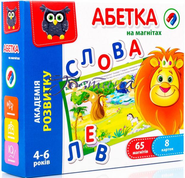 Магнітна абетка Vladi Toys являє собою набір букв на магнітах, які з легкістю можна прикріпити на холодильник або мольберт, і 8 листівок із завданнями (вибрати правильну літеру, скласти кросворд, скласти слово і т. п.)