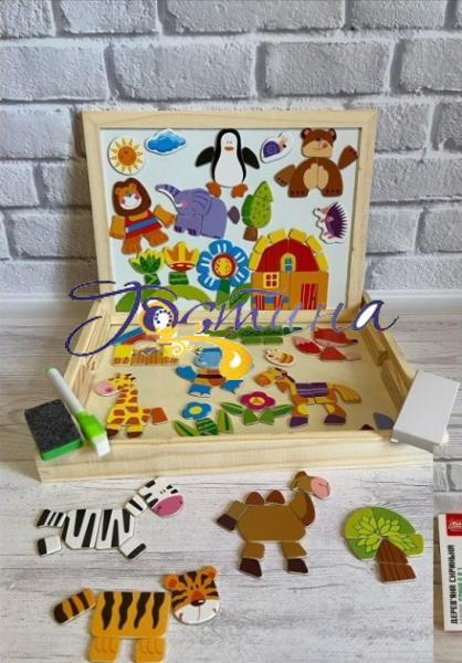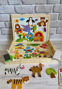 Дерев'яна коробка з дошкою і різноманітними магнітними деталей всередині дозволить дитині створювати безліч цікавих фігурок на ній. На магнітній дошці також можна малювати маркером на водній основі, а зворотний бік призначений для малювання крейдою.