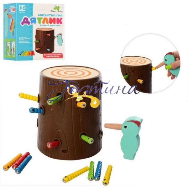 Дитяча магнітна гра Дятлик. Кожен черв'ячок має магнітну головку і захований в основу дерева в своїй нірці! На дзьобі теж магнітна основа, за допомогою якої можна витягнути черв'ячка! Магніти щільно з'єднуються і тому черв'яків легко добути з дерева! Ну що ж вперед! Малюкові буде цікаво і весело проводити час! Гра розвиває дрібну моторику, координацію рухів, гнучкість кисті, окомір, посидючість і концентрацію над результатом.