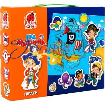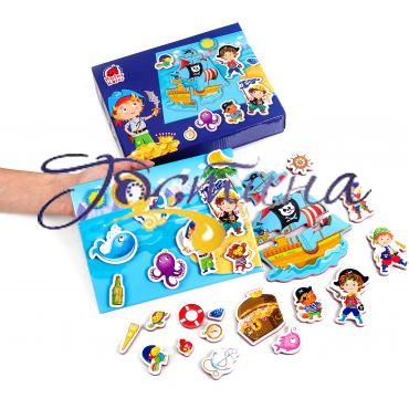 Ігровий набір «Пірати» містить магнітну дошку із зображеним на ній сюжетом, а також 28 тематичних магнітів. Прикріплюючи їх до дошки, дитина створить свою оригінальну історію. Вигадуйте нові події і обмінюйтеся ними один з одним!