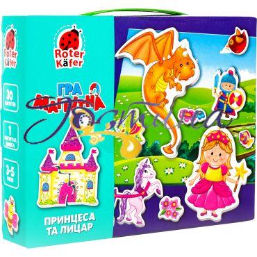 Ігровий набір «Принцеса та лицар» містить магнітну дошку із зображеним на ній сюжетом, а також 30 тематичних магнітів. Прикріплюючи їх до дошки, дитина створить свою оригінальну історію. Вигадуйте нові події і обмінюйтеся ними один з одним!