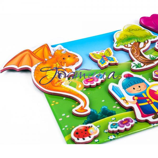 Усі магніти об'ємні, їх зручно кріпити та знімати. У процесі гри дитина тренуватиме уяву, фантазію, логічне мислення, мовлення і дрібну моторику. Створюйте казку своїми руками!