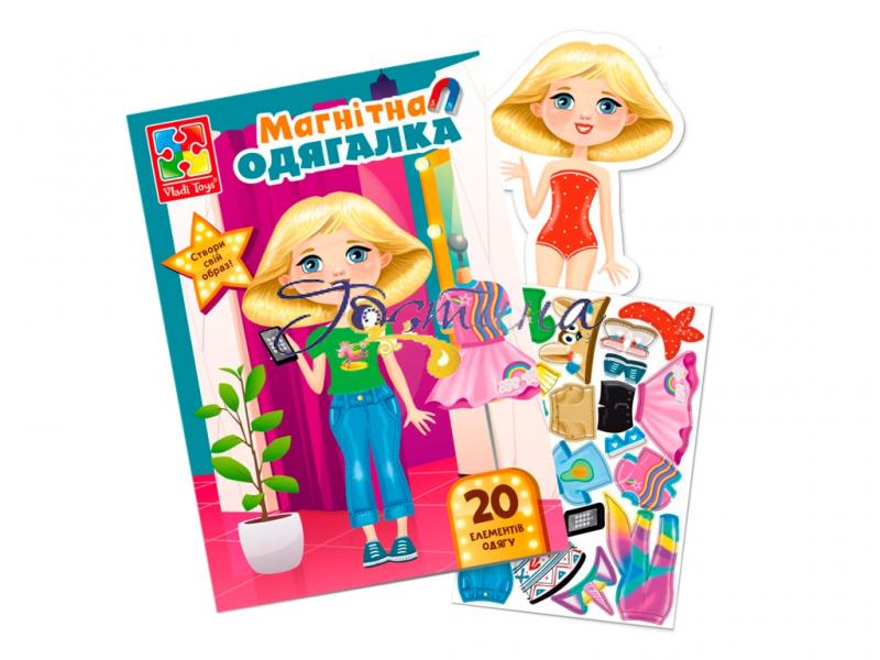Підбираємо магнітний одяг для дівчинки, кріпимо його до ляльки і створюємо незвичайні образи.