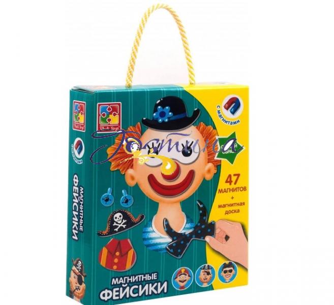 У наборі ви знайдете 8 різних фейсиків. Кожен із них має свої магнітні атрибути. Підбирайте їх правильно та кріпіть до спеціальної магнітної дошки. Наприклад, принцу потрібна корона, а пожежнику — каска.