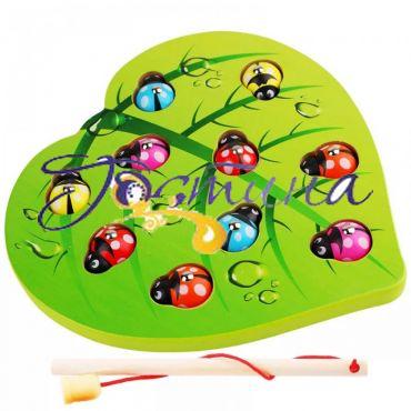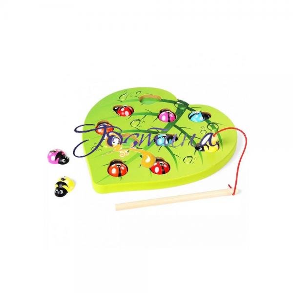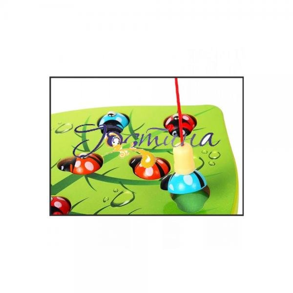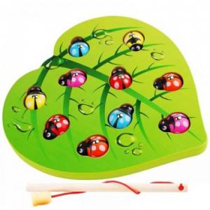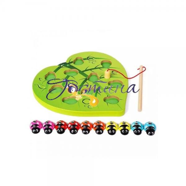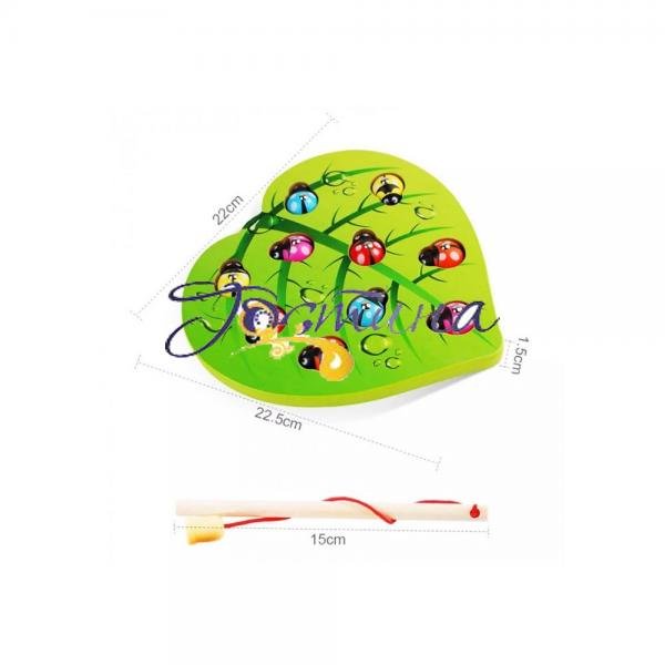 У наборі є все необхідне для того, щоб весело провести час: дерев'яна основа - листок, на основі сидять сонечка різних кольорів, які необхідно ловити за допомогою вудки з магнітом.