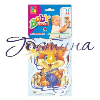 Картинки із зображеннями домашніх улюбленців потішать малюка. Контури пазла повторюють обриси персонажів. У наборі два пазли різної складності. Магнітні деталі – великі, легкі та приємні на дотик. Малюк не тільки тренуватиме рученята, пам’ять та логічне мислення, а й познайомиться із тваринками. Під час гри промовляйте їхні назви, розкажіть дитині, чим харчується кожна з них.