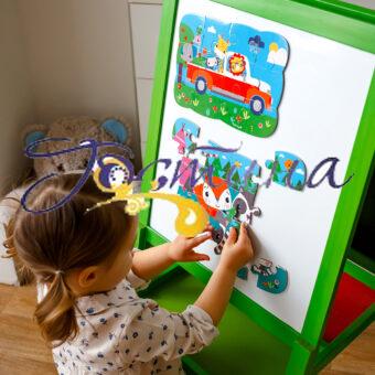 Усі деталі об’ємні, тож їх легко та приємно тримати дитячою ручкою. Вони надійно скріплюються між собою, тож зображення не розпадається. Завдяки основі-магніту, пазлами можна грати на холодильнику або на будь-якій іншій магнітній поверхні.