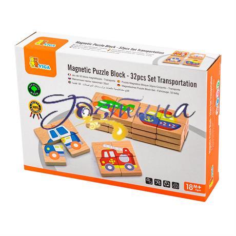 Магнітні пазли від Viga Toys Транспорт складаються з 32 квадратних елементів із дерева на магнітах для складання зображень різних транспортних засобів. Навчальний набір підходить дітям від 18 місяців переддошкільного віку для гри в поєднанні з магнітними дошками, а також окремо.