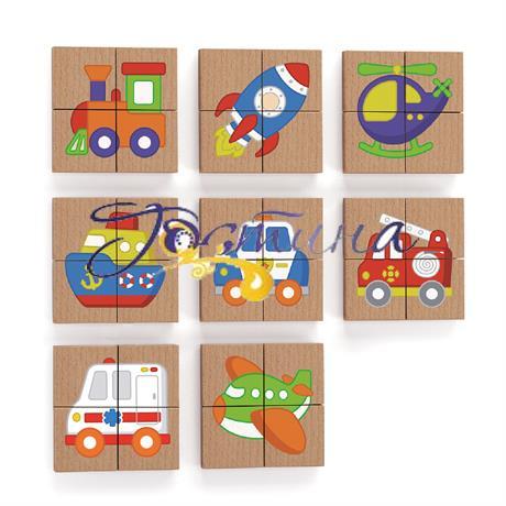 Як можна грати з дітьми? Спочатку зберіть зображення транспорту з частин і назвіть їх. Дайте дітям зіставити картинки з назвами засобів пересування і запам'ятати їх. Потім змішайте дерев'яні плитки. Візьміть по одному елементу кожного з 8 міні-пазлів. Викладіть їх на столі або прикріпіть на магнітну дошку. Залиште достатньо місця для доповнення зображень. Змішайте решту дерев'яних частин. Попросіть дітей знайти відповідні елементи до кожної картинки, називаючи вид транспорту.