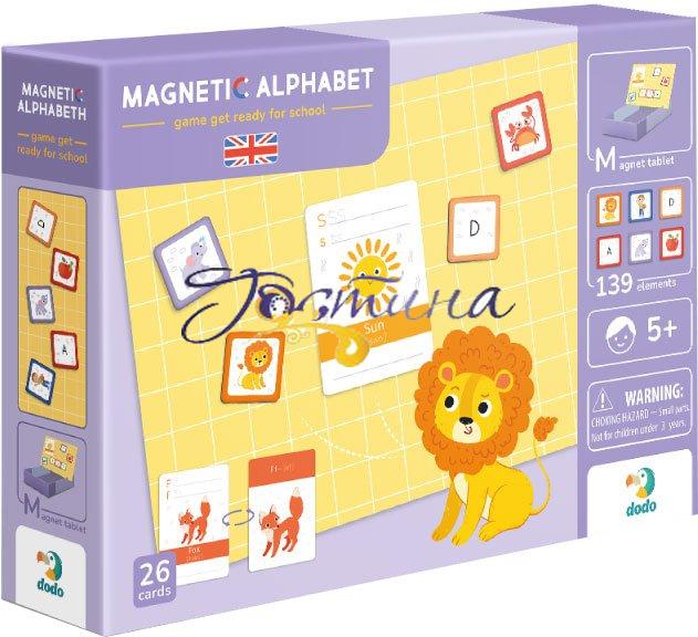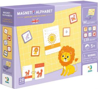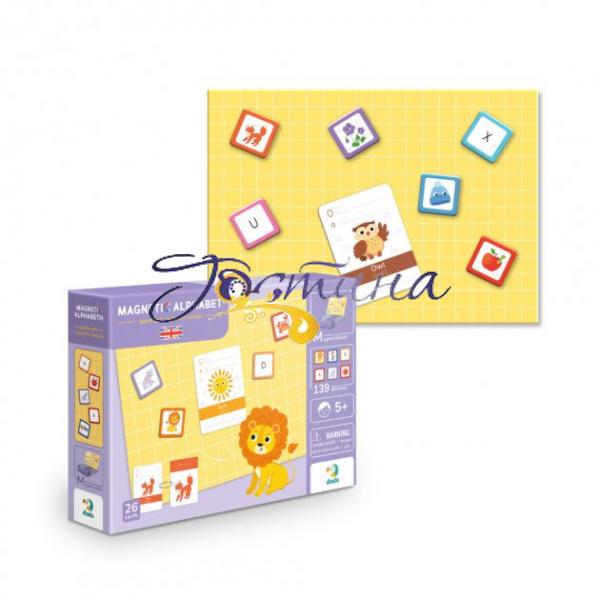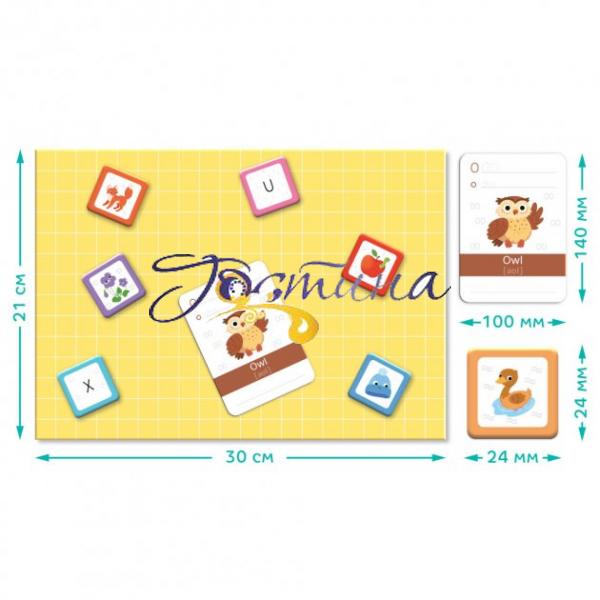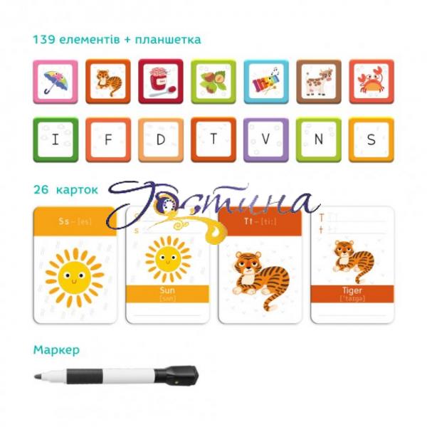 Розвивальна магнітна гра. 1 магнітна планшетка, маркер, 139 магнітних елементів, 26 карток, за допомогою яких можна вивчати літери англійського алфавіту та складати слова.
