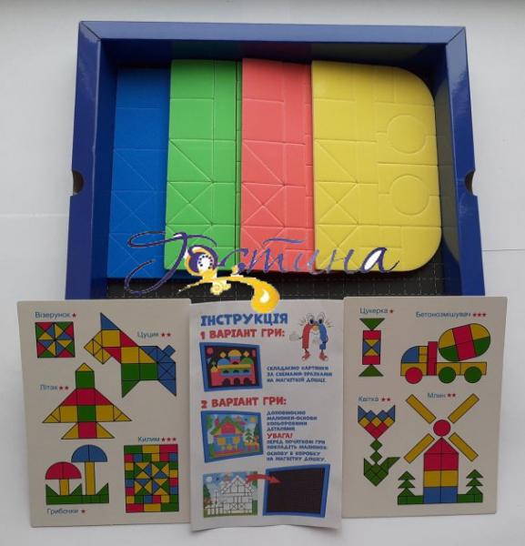 Дитині сподобається складати цікаві картинки з яскравих кольорових елементів, які надійно кріпляться до магнітної дошці-основі. Запропонуйте малюкові вибір: скласти картинку з кольоровим зразком або проявити фантазію і придумати власний малюнок.