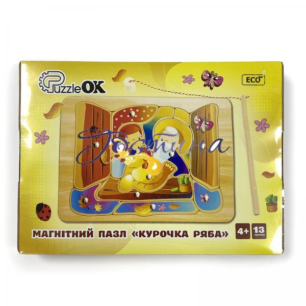 Магнітний пазл “Курочка Ряба” — цікава іграшка для дітей від 3 років. Він виконаний з натурального безпечного матеріалу, фарби не стираються та не викликають алергії. Кожна деталь має зашліфовані краї для запобігання подряпинам шкіри рук.