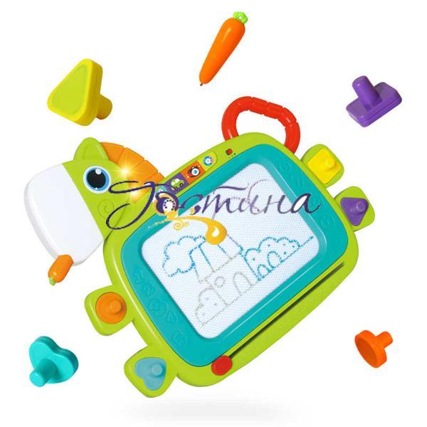 Магнітна дощечка для малювання - це чудовий спосіб для тренування дрібної моторики малюка, розвитку його творчого потенціалу і для першого його знайомства з буквами, цифрами і геометричними фігурами. За допомогою невеликого стилуса з металевим наконечником дитина буде малювати на магнітному полі все, що йому захочеться. Важіль внизу дошки допоможе стерти намальоване і почати все заново. Додатково дощечка для малювання 3131 обладнана підсвіткою гриви коня і звуковими ефектами. У іграшки 2 рівня гучності і зручна ручка для перенесення. Ефекти працюють від 3-х батарейок 1.5V ААА (не входять в комплект).