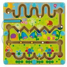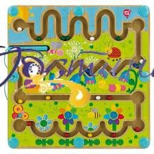 Неймовірно красивий магнітний лабіринт із дерева вміє приваблювати і в прямому, і в переносному значенні! Відірватися від такої розваги важко навіть дорослим.Суть така: у великій квадратній дошці вирізані маршрути, за якими мають рухатися маленькі металеві кульки.Мета — за допомогою палички довести їх від старту до фінішу.Гра активно тренує координацію рухів.На особливу увагу заслуговує дизайн дерев'яного магнітного лабіринту — він схожий на лісову галявинку, де ростуть квіти, повзають гусениці, літають бджоли.Високоякісні екологічні матеріали та ручне оброблення дерева роблять гру безпечною навіть для дитини 3—5 років.
