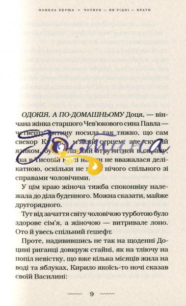 «Важить не час, а людина в обставинах часу» — цю свою тезу письменниця розкриває через драматичну історію кількох гуцульських родин часів Першої світової війни. Великі пристрасті звичайних людей, легке марево містики, вічні дилеми Любові–Ненависті, Гріха–Спокути, кількаярусний сюжет...
