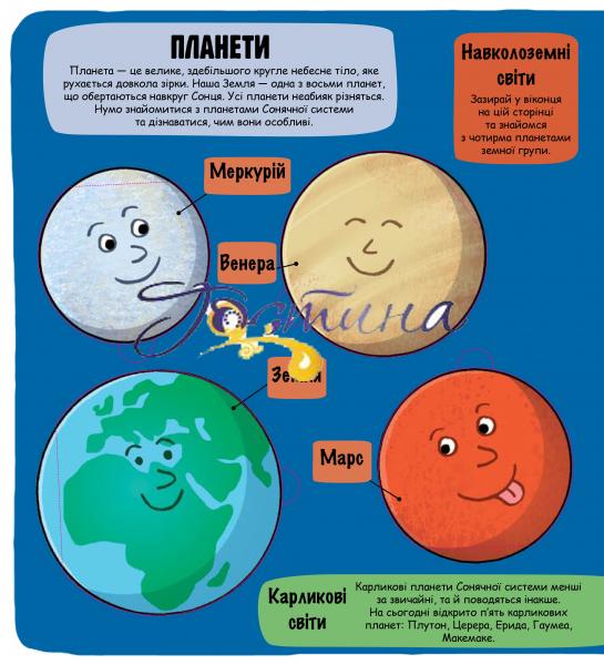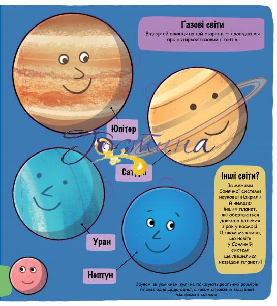 Увага всім маленьким дослідникам! Вирушаймо в космос, щоб розвідати якнайбільше про Сонячну систему та простори далеко за її межами. Заглядай у віконця - і побачиш, на що схожі планети, як влаштоване Сонце і багато інших космічних чудес. Попереду безліч відкриттів!