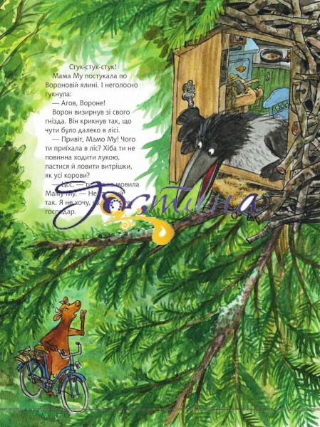 Хто сказав, що корови не повинні гойдатися на гойдалках? Це все стереотипи! Якщо дуже хочеться – то можна! Так і наша корівка Мама Му якогось разу, побачивши, як діти граються, вмовляє свого друга Ворона зробити для неї власну гойдалку. Ворон, звісно, впирається, але хто ж може опиратися чарам Мами Му?! Словом, Мама Му вкотре долає всі стереотипи щодо того, як правильно поводитися коровам (чи ж лише коровам?!) « — Ти — корова, Мамо Му, — сказав Ворон. — А корови не гой-да-ють-ся. — А от і гойдаються, — відрубала Мама Му. — Жаль корів, які зроду не гойдалися. — Жаль! — скрикнув Ворон. — Кар-р! Корови ходять луками й пасуться. А потім стоять, ремигають і ловлять витрішки. А тоді заходять в корівник і їх там доять. І вони відчувають від того задоволення. — А я не відчуваю, — сказала Мама Му. — Не треба весь вік стояти, ремигати і ловити витрішки через те, що ти корова.»