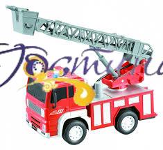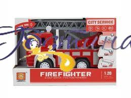 Машина пожежна інерційна зі сходами оснащена рухливими деталями, світловими і звуковими ефектами, 3 кнопки на даху машинки відтворюють звук мотора, клаксона і звук заднього ходу, на даху розташовані 2 мерехтливих лампочки (проблискові маячки). Резервуар машини заповнюється водою і за допомогою кнопки через рухливу гармату подається струмінь води.