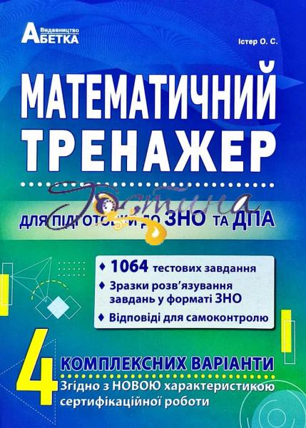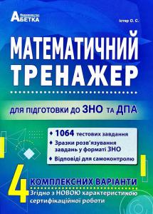 Посібник містить 1064 тестових завдань, структуру яких адаптовано до технічних характеристик завдань з математики для зовнішнього незалежного оцінювання, зразки розв’язування завдань, 4 комплексних варіанти завдань. Опрацювання тестових завдань дає змогу як за допомогою вчителя, так і самостійно закріпити теоретичний матеріал та підготуватися до пробного тренувального тестування у форматі ЗНО.