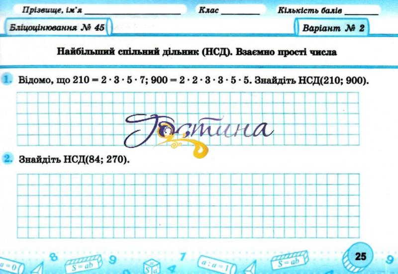 Посібник призначений для поточного контролю навчальних досягнень учнів 5 класу, які вивчають математику за модельною навчальною програмою «Математика. 5-6 класи» та підручником «Математика. 5 клас» (авт. О. С. Істер). Він містить 39 відривних карток у двох варіантах. Орієнтовний час для роботи з ними — 10 хв. Кількість завдань з кожної картки та систему їх оцінювання учитель / учителька може вибирати самостійно, орієнтуючись на рівень навчальних досягнень учнів.