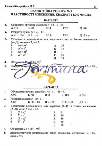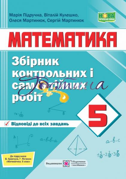 Посібник призначений для поточного і тематичного контролю навчальних досягнень учнів 5 класу закладів загальної середньої освіти й містить 11 контрольних і 25 самостійних робіт, які охоплюють усі теми курсу математика 5 класу. Він відповідає модельній навчальній програмі “Математика. 5-6 клас” (авт. : Мерзляк А. Г. та ін.) й підручнику “Математика. 5 клас” (авт. : В. Кравчук, Г. Янченко).