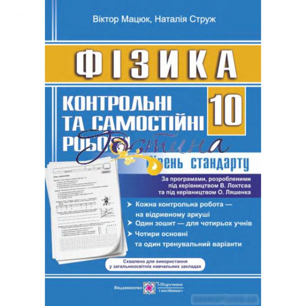 Посібник містить 9 тематичних контрольних робіт, кожна з яких складається із п’яти рівноцінних варіантів та 3 самостійні роботи, кожна з яких складається з чотирьої рівноцінних варіантів. Завдання дібрано відповідно до чинних програм, підручників та методичних рекомендацій. Для учнів 10 класу, учителів фізики.