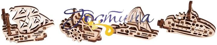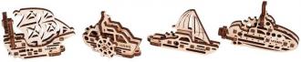 Унікальний набір з 4-х окремих мініатюрних моделей для самостійної збірки для дорослих і дітей від 5 до 80 років і більше. У комплект входить Вітрильна яхта, Вітрильник, Човен, Підводний човен, кожна модель містить базові механічні елементи.