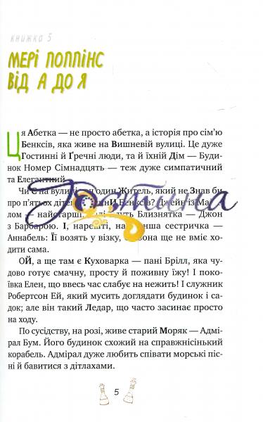 Гадаєте, ідеальна няня існує? Яка вона? Може, та, що кожного ранку дивує вишуканими сніданками за рецептами з власної кулінарної книжки? Чи та, яка вигадує захопливу абетку, щоб навчити дітей грамоти? А може, вона вміє літати? Мері Поппінс — саме така няня! Вона неперевершена, незабутня і непередбачувана!   Пориньте в дивовижні пригоди Джейн, Майкла та їхніх нових друзів! І як тільки Мері Поппінс дає їм усім раду?!