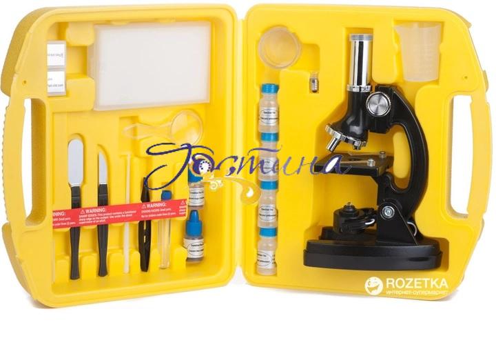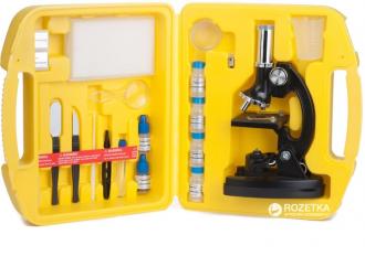 Мікроскоп зі збільшенням 300х, 600х і 1200х, набір предметного й покривного скла, різних інструментів, колб і баночок. Разом в наборі 96 предметів.