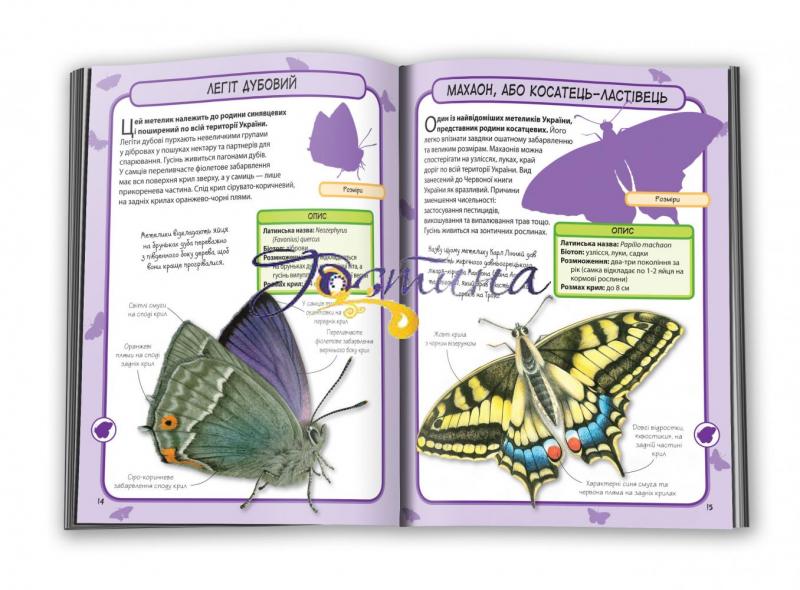 За допомогою цього довідника ви зможете розпізнати 50 найвідоміших видів денних і нічних метеликів. Ви дізнаєтеся про їхні основні ознаки та спосіб життя.