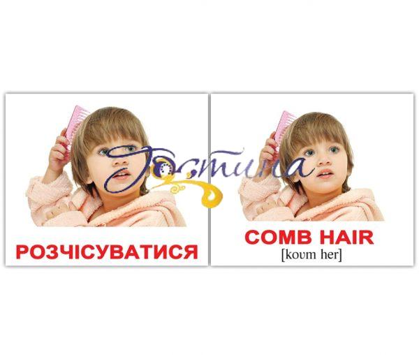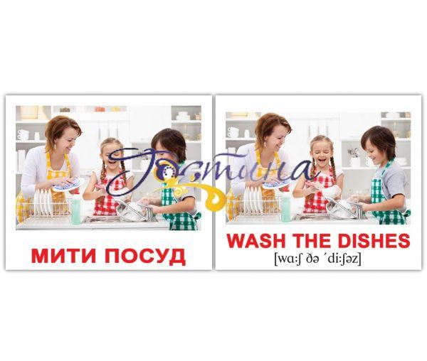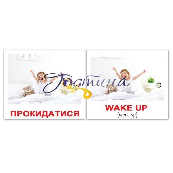 Дорожній набір включає 40 двосторонніх карток із зображеннями різних дій з підписами англійською мовою з транскрипцією. На звороті – ті ж картинки з підписами українською мовою.