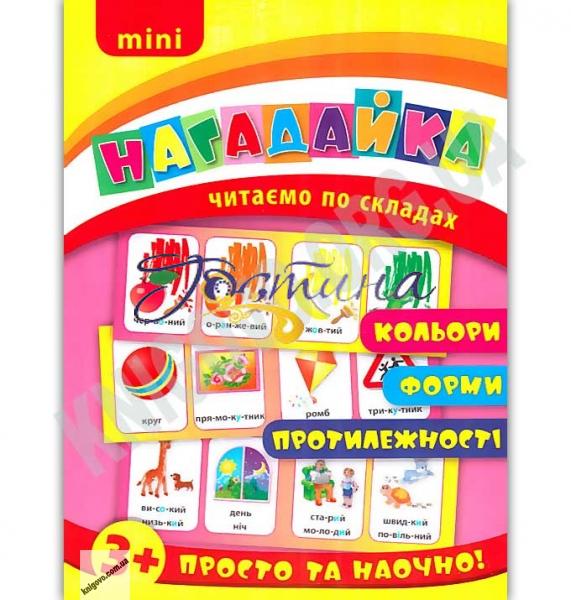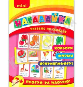 Mini нагадайка Кольори Форми Протилежності Читаємо по складах. Це видання познайомить малюка з назвами кольорів, формами та словами з протилежними значеннями. Зручний невеликий формат, слова, які поділені на склади, та наочна форма подання матеріалу допоможуть дітям швидко й легко опанувати нові знання.