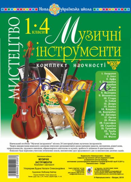 Навчальний посібник “Музичні інструменти” містить 24 ілюстрації різних музичних інструментів. Творче використання комплекту допоможе вчителеві урізноманітнити уроки навчання грамоти, математики, рідної мови, природознавства, трудового навчання, образотворчого мистецтва та музики, зробити їх цікавими й оригінальними. Комплект буде корисним учителям початкових класів, вихователям груп продовженого дня та вихователям дитячих садків.