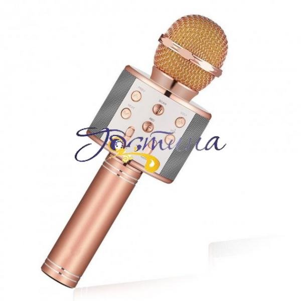 Бездротовий Караоке-Мікрофон WS-858 - це пристрій об'єднав в собі вокальний Bluetooth мікрофон і універсальну стерео колонку. Мобільний караоке-мікрофон може стати відмінним інструментом для початківців вокалістів або засобом провести приємний вечір в компанії друзів. Відмінною особливістю даної моделі є барвисте світлодіодне підсвічування динаміків з двох сторін. Мікрофон можна використовувати як MP3-плеєр, аудіо колонку або караоке в комбінації зі смартфоном або планшетом, і навіть як мобільний зарядний пристрій в екстрених ситуаціях. Караоке мікрофон оснащений бездротовим модулем Bluetooth, FM радіоприймачем, слотом USB, TF і microUSB для читання / трансляції музичних файлів. Всі елементи підключення розміщені в нижній частині рукоятки мікрофона, а елементи управління зручно розташувалися на ручці, прямо під великим пальцем.