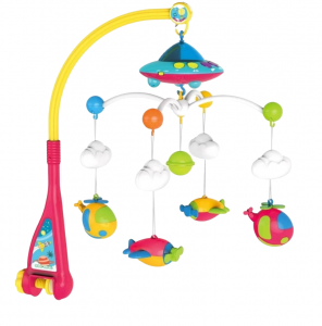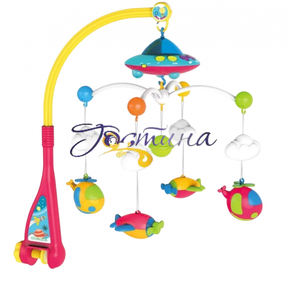 У каруселі є проектор нічного неба, музична шкатулка у вигляді літаючої тарілки та пластикові іграшки, які зацікавлять малюка.