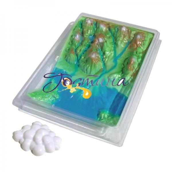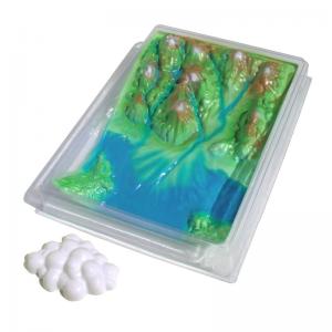 1. Призначення Модель призначена для використання в початкових і старших класах загальноосвітніх шкіл на уроках природознавства та географії, в якості демонстраційного посібника при вивченні теми « Кругообіг води в природі ». 2. Комплектність 1. Модель «Кругообіг води в природі»-1шт (складається з 3-х деталей)2. Паспорт-1шт 3. Пакувальна коробка-1шт 3. Характеристики Модель являє собою рельєфну ділянку поверхні суші і Світового океану виконану в кольорі і розміщену на прозорій підставці. Зверху на неї встановлюється прозорий «купол» з «хмарою», що імітує верхні шари атмосфери. Посібник дозволяє наочно продемонструвати процес кругообігу води: випаровування її з поверхні океану, конденсацію водяної пари в хмари, випадання опадів і поповнення рівня світового океану за рахунок ресурсів річок, льодовиків, підземних вод. Щоб провести демонстрацію цих явищ, необхідна лампа, вода, лід. Для демонстрації випаровування, учитель наливає воду у поглиблення макета, що імітує океан, направляє на неї лампу і через проміжок часу показує, що рівень рідини зменшився - відбулося її випаровування. Якщо в цьому досліді на макет з водою поставити прозорий «купол» і направити на нього лампу, можна спостерігати процес конденсації водяної пари на внутрішній поверхні «купола». Імітувати випадання опадів можна наступним чином: у поглиблення «купола» кладеться лід, зверху він закривається «хмарою». На нього спрямовується світло від лампи (в даному випадку вона виступає як джерело теплового випромінювання) - лід починає танути, і через отвори в «куполі» вода капає на поверхню, що імітує Світовий океан. Розрізняють малий і великий кругообіг води в природі. Малий кругообіг пов'язаний з випаданням атмосферної води у вигляді опадів у Світовий океан, великий кругообіг - у вигляді опадів на суші.