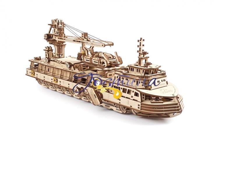 Усі елементи «Науково-дослідного судна» виготовлено з високоякісної деревини, а для складання вам не знадобляться ані клей, ані будь-які додаткові інструменти. Елементи корпусу в скелетон-дизайні дозволяють роздивитися, як працюють внутрішні механізми моделі. Ви можете побачити роботу гумодвигуна та маятника, що забезпечують рівномірний і плавний рух судна та імітують звук дизельного двигуна. Модель має три режими руху: вперед, із поворотом і автоматичне лавірування. Перемикання режимів здійснюється вручну за допомогою спеціального важеля.