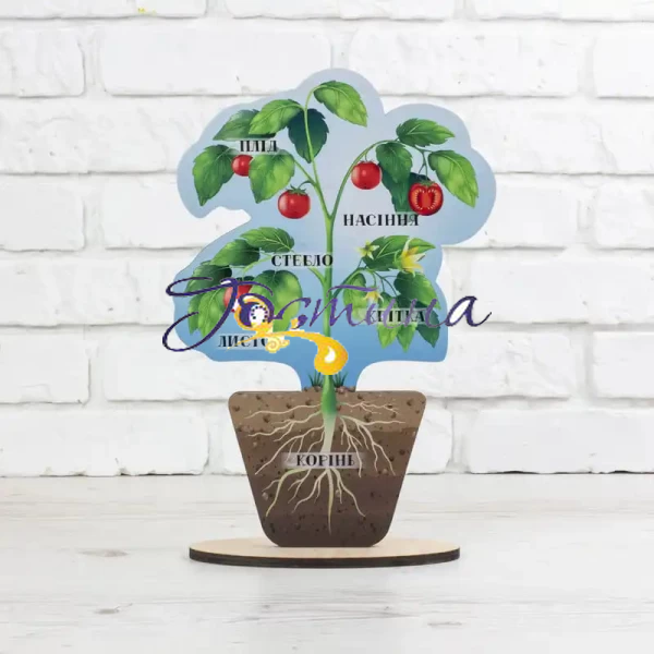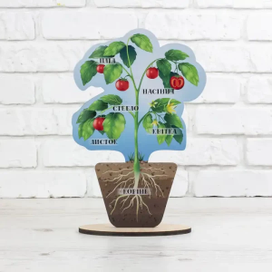 Габаритні розміри, мм: 350?235 Матеріал: Фанера Виріб у вигляді плоскої моделі на підставці. Представляє будову рослини: корінь, стебло, листок, квітка, плід та насіння. Використовується в якості демонстраційного матеріалу на уроках природознавства.