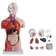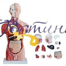 Модель з прогумованими органами з підвищеною стійкістю до ударів. Чоловічий тулуб, модель зіі знімними внутрішніми органами. Невелика 13-частинна модель внутрішньої структури тулуба людини, розміщена на основі. Найважливіші елементи можна видалити і безпосередньо ознайомити з їх будовою, це: серце, шлунок, легені, печінка, підшлункова залоза з селезінкою, товстий і тонкий кишечник, чоловічі репродуктивні органи (відокремлені). Основні кровоносні судини та нирки позначені на моделі; знявши кришку з одного з них, ви побачите їх структуру. Додатковою перевагою є можливість дізнатися деталі будови голови (її можна відокремити від тулуба і розділити на дві частини), де видно м’язи та м’язові прикріплення, а після відкриття мозку можна спостерігати мозкок (одна з півкуль видаляється). Чудово представлено м'язи на тулубі
