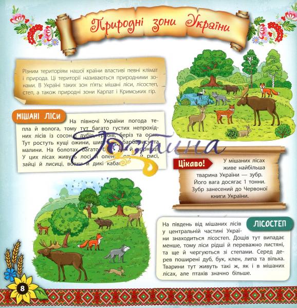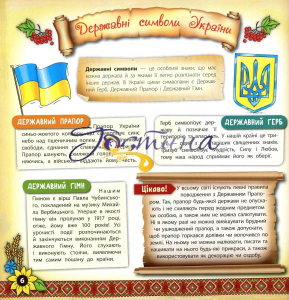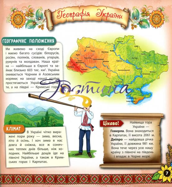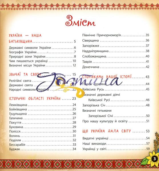 Ця книга познайомить дітей з історією, побутом, культурою та традиціями України, її непересічними особистостями та визначними винаходами, розкриє значення державних і народних символів, розповість про природу, архітектурні пам’ятки та визначні місця нашої Батьківщини. З книги діти дізнаються, хто такі українці, чим вони пишаються і славляться на весь світ.