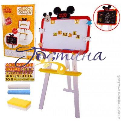 Чорна сторона дошки призначена для малювання крейдою, а біла магнітна, з кріпленням під аркуші паперу.